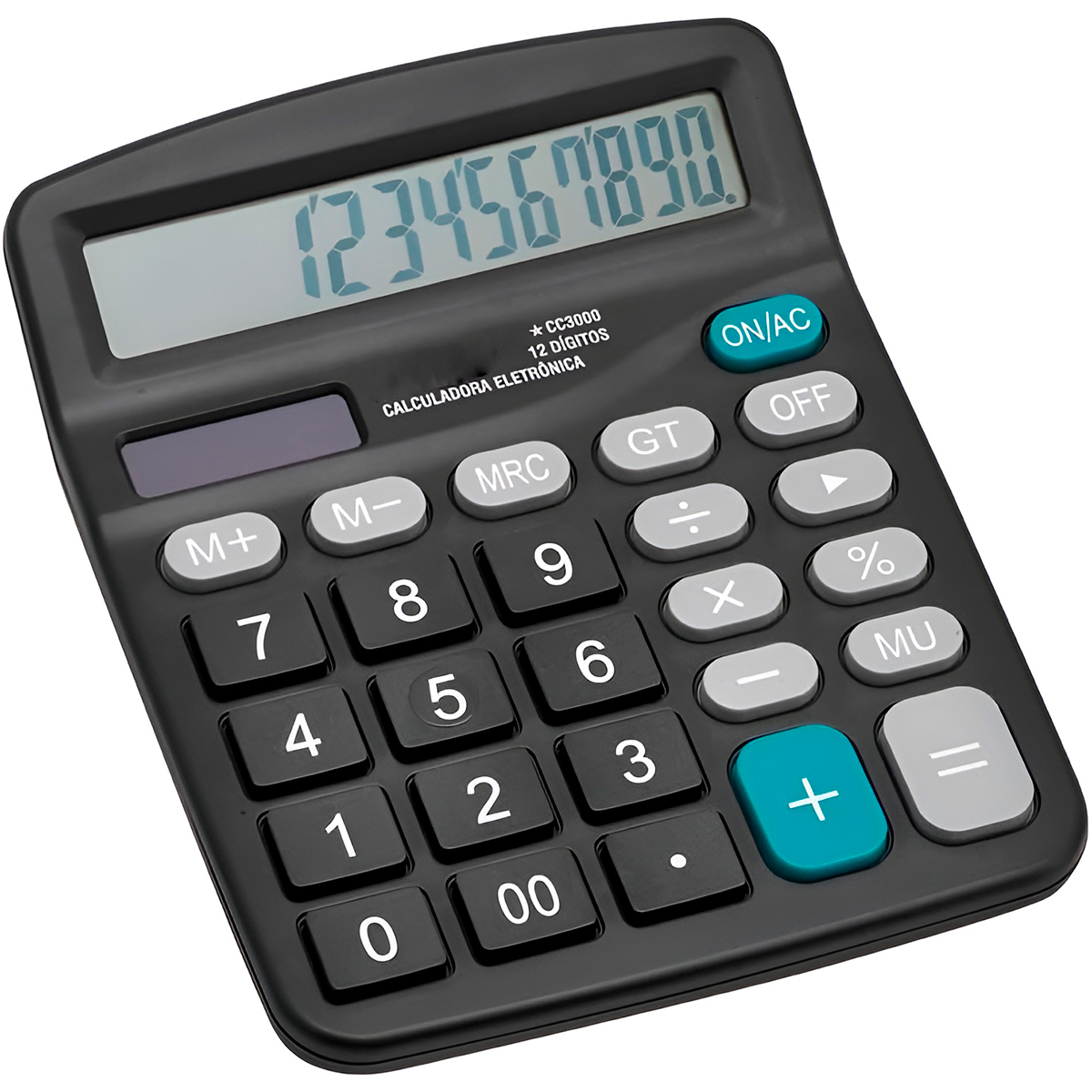 - Realiza as quatro operações básicas, além de cálculo de porcentagem (%), raiz quadrada (√) e memória (M+, M-, MRC).