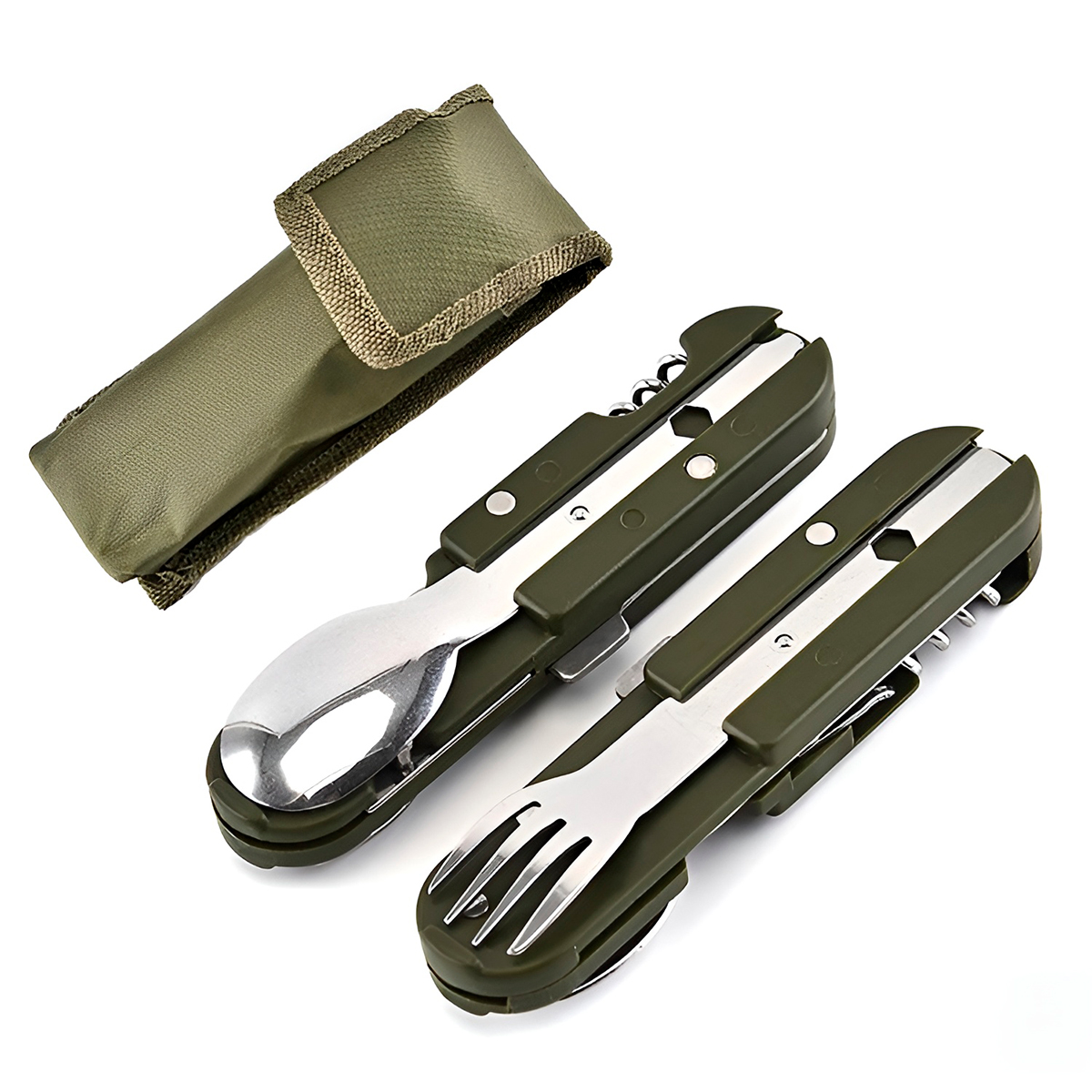 - Com um design inteligente de mecanismo dobrável e destacável, este kit oferece as funções de colher, garfo, faca e abridor de garrafas em um único acessório compacto.