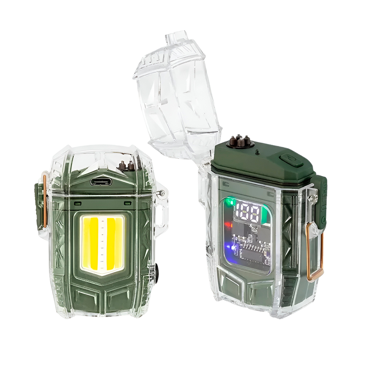 - A saída de luz inteligente, localizada ao longo do corpo do isqueiro e na parte inferior, permite uma iluminação eficiente e direcionada.