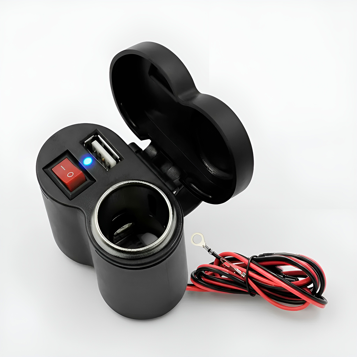- A tomada é projetada para ser instalada de forma fácil no guidão ou em outro local estratégico da sua moto.